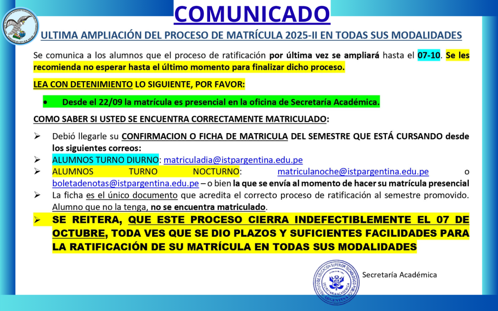 AMPLIACIÓN DEL PROCESO DE MATRÍCULA 2025-II EN TODAS SUS MODALIDADES HASTA 07 DE OCTUBRE