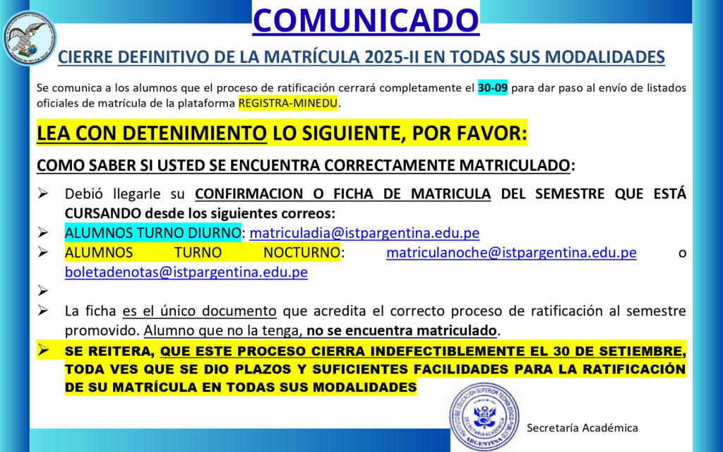 CIERRE DEFINITIVO DE LA MATRÍCULA 2025-II EN TODAS SUS MODALIDADES (PARA MAYOR INFORMACIÓN CLIC EN LA IMAGEN)